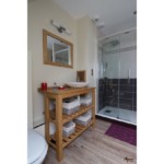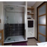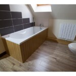 Aménagement d’une salle de bains. Fabrication d’un meuble support de lavabo et d’un encadrement pour le miroir. Une partie des cache-tuyaux en bois est surmontée d’un petit meuble pour divers rangements. Le dessous de la baignoire est habillée par des lattes. Dans le renfoncement au-dessus du sèche serviettes deux étagères sont créées avec, au fond, une goulotte pour acheminer les réseaux électriques.